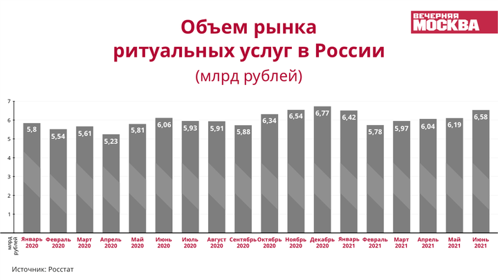 При этом объем выручки ритуальных агентств, согласно информации того же Росстата, за первую половину 2021 года вырос всего на девять процентов по сравнению с аналогичным периодом в 2020 году. Россияне потратили на ритуальные услуги 36,9 миллиарда рублей, а за аналогичный период прошлого года — 34,07 миллиарда. В столице все пропорционально — на 18 процентов больше смертей и на 18 процентов рост выручки ритуальных агентств.