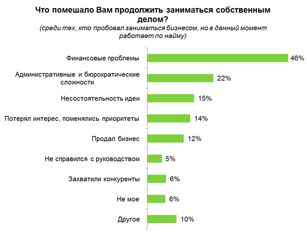 Финансовые трудности в каждом втором случае являются причиной отказа от собственного бизнеса. 22% тех, кто вел свое дело, но в данный момент работает по найму, отметили, что всему виной административные и бюрократические сложности. Несостоятельность идеи или потеря интереса являются причинами ухода из предпринимательства у 15% и 14% опрошенных соответственно.