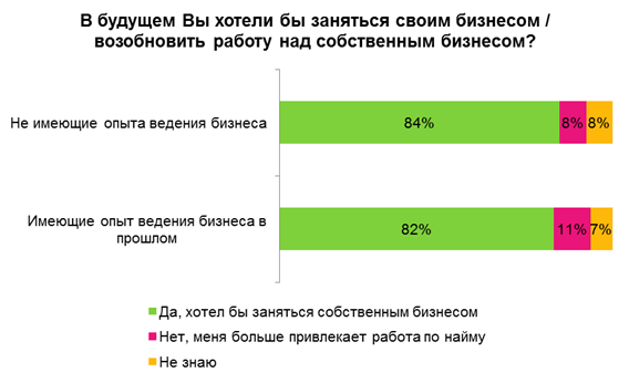 84% опрошенных мечтают создать собственный бизнес. Более того, практически столько же респондентов (82%), которые уже имели свое дело, но по той или иной причине отказались от него, сохраняют энтузиазм и хотят попытать счастья вновь.
