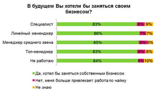Процент желающих организовать собственный бизнес среди топ-менеджеров и специалистов одинаков (по 83%).