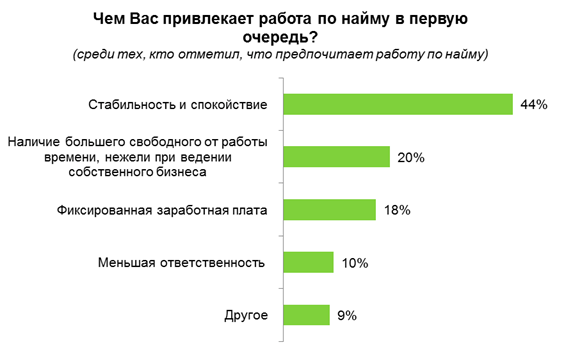 *Работа по найму привлекает людей в первую очередь своей стабильностью и спокойствием (44%).
