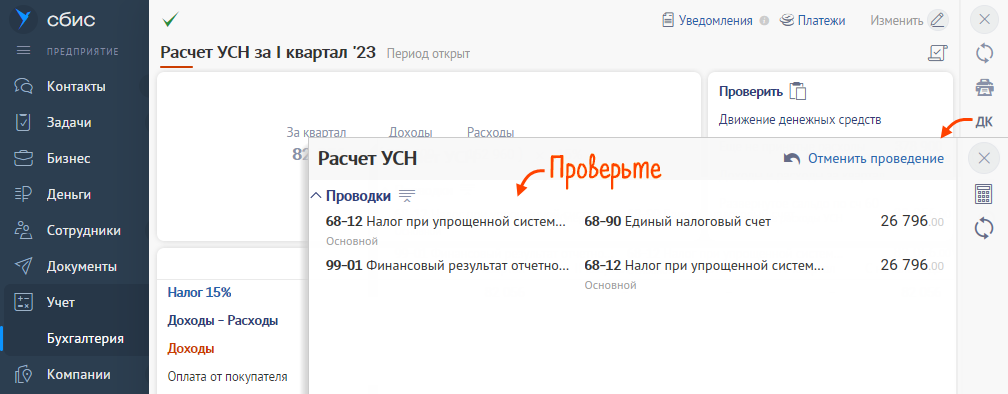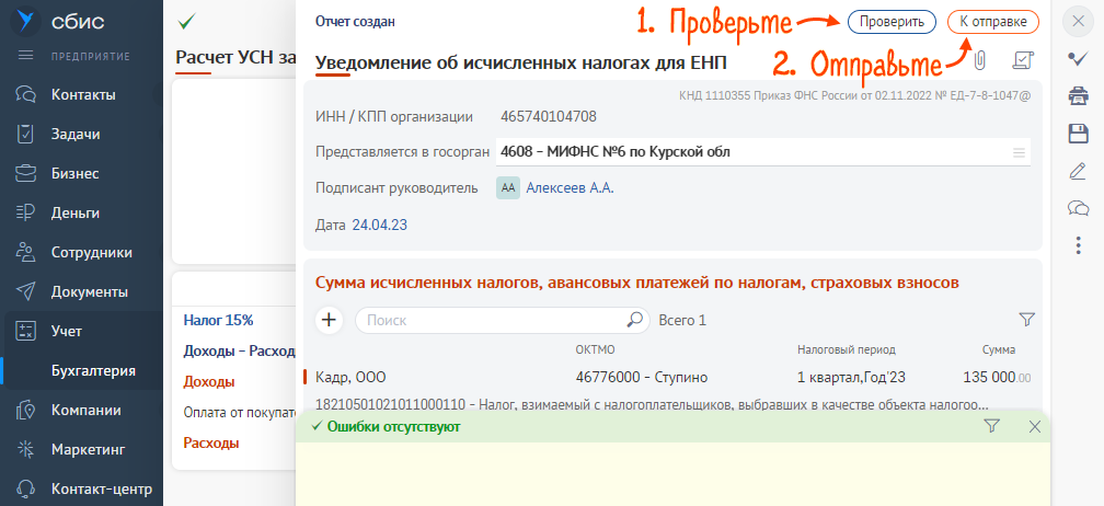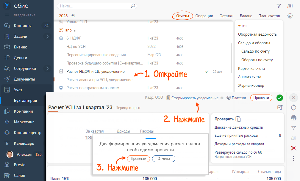 Откройте документ расчета в календаре бухгалтера или из раздела «Учет/Налоги». Далее из документа расчета оформите декларацию или уведомление. СБИС заполнит суммы и реквизиты в уведомлении по данным учета.