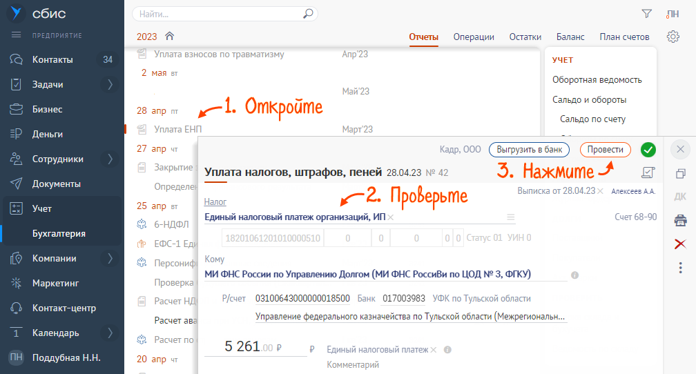 Данные о задолженности будут отображаться на счете 68-90. В календаре бухгалтера откройте событие по уплате налогов и сформируйте единое платежное поручение по оплате ЕНП.