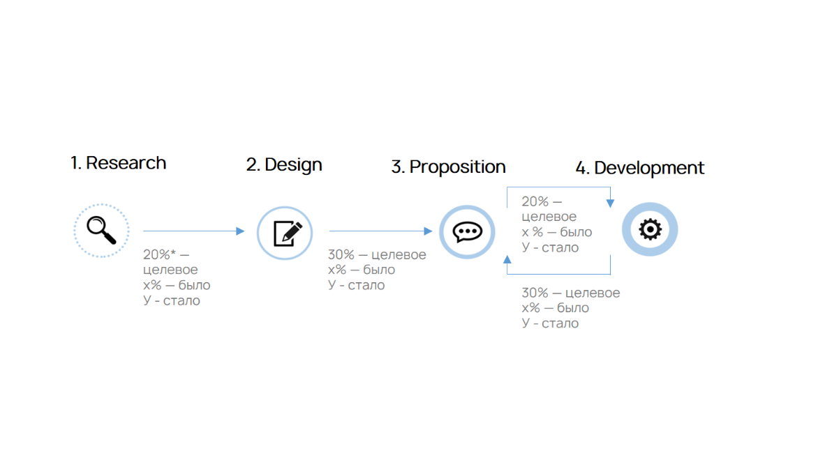 Процентами отмечены та степень реализации Customer Value, которая формируется на этом этапе. То есть, если на рынке продукт стоит 100 р, но на этапе ресерч, Вы способны придумать продукт стоимостью 20%, остальными 80% ценности он обрастет, пройдя другие этапы.