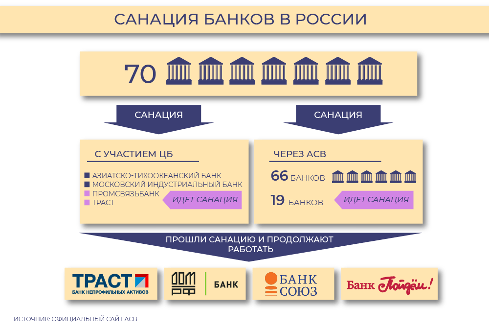 На протяжении почти десяти лет за санации отвечало исключительно Агентство по страхованию вкладов, которое чаще всего привлекало в эту процедуру банки-инвесторы. Те сначала получали контроль над кредитной организацией, которую собирались спасать, для чего выкупали долю в ее уставном капитале. А потом получали льготные займы через АСВ у Центробанка на санацию. Деньги обычно выдавались на 10–15 лет под 0,51% годовых.