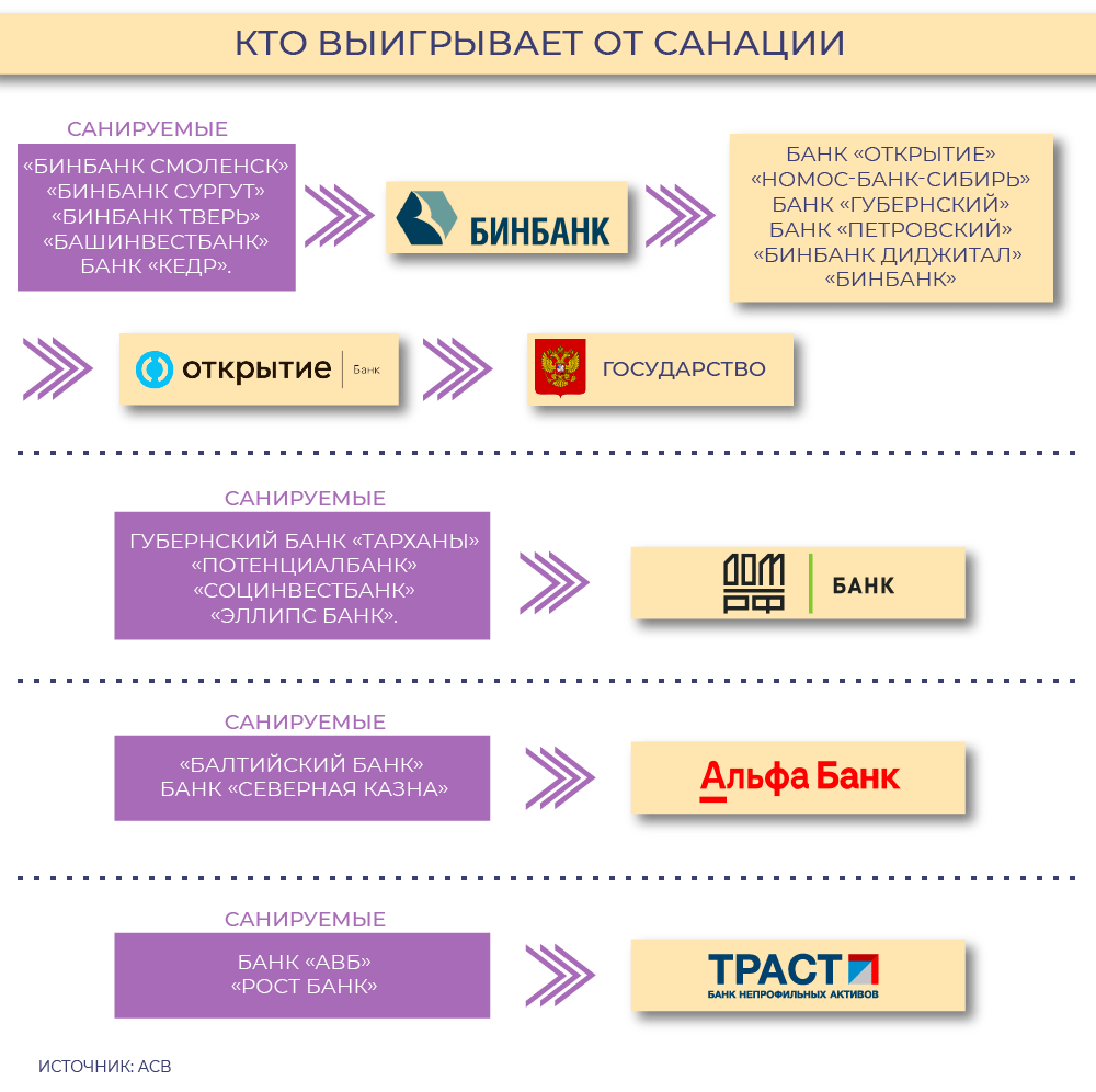 Главными бенефициарами этого процесса обычно становятся крупные игроки банковского сектора, которые берут себе на санацию банки: они получают льготные кредиты от ЦБ, распоряжаются активами финансово неблагополучных организаций и увеличивают пул своих клиентов. А еще больше выигрывают власти: благодаря санации «Открытия» крупнейший российский частный банк стал государственным.