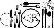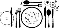 1. Сервировочная и закусочная тарелки. 2. Пирожковая тарелка с ножом для масла. 3. Столовый прибор.4. Закусочный прибор. 5. Рыбный прибор. 6. Десертные ложка и вилка. 7. Фужер, рюмки: рейнвейная, лафитная, водочная.