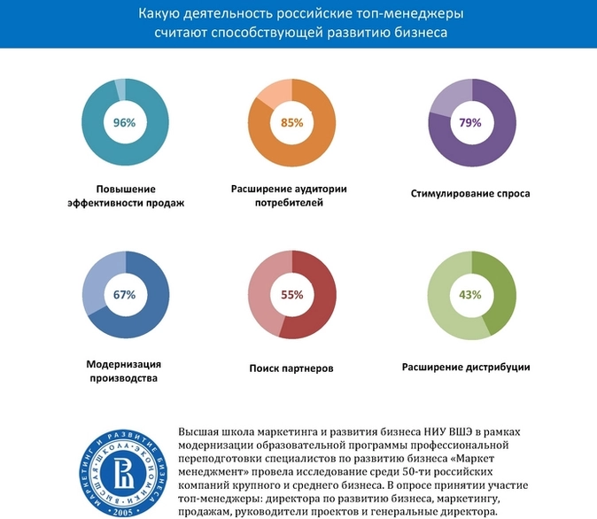 Значит, дело не только во внешних обстоятельствах, но и внутренние факторы отечественной бизнес-практики мешают этому. Мы в Высшей школе маркетинга и развития бизнеса НИУ «Высшая школа экономики» спросили у российских топ-менеджеров о том, какую активность внутри компании они воспринимают как развитие бизнеса.
