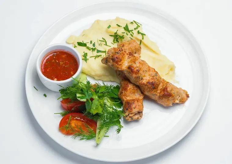 Люля-кебаб из курицы с картофельным пюре, аджикой и салатом по-грузински