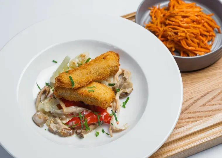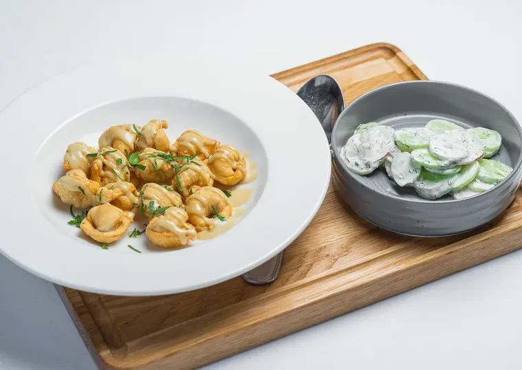 Рыбные пельмешки из судака и трески, запеченные в японском соусе со свежим салатом из огурцов, редиса, зелени со сметаной