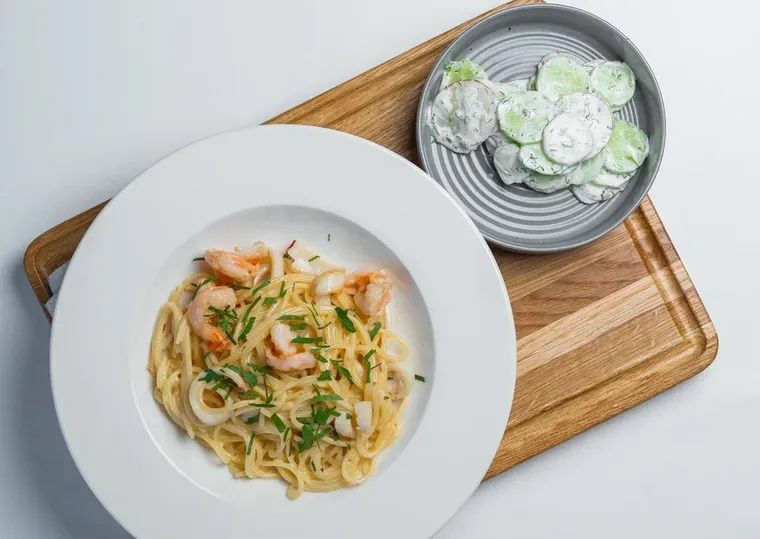 Спагетти с морепродуктами в сливочном соусе и свежим салатом из огурцов, редиса, зелени со сметаной