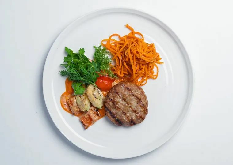 Бифштекс-гриль из мясного фарша с овощами и салатом морковь по-корейски