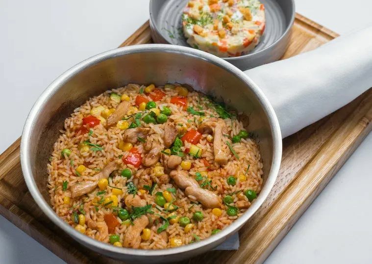 Рис запеченный с курицей и овощами в томатно-пряном соусе и салатом Оливье