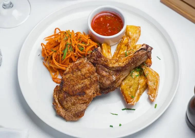 Свиная корейка с картофельными дольками, аджикой и морковью по-корейски