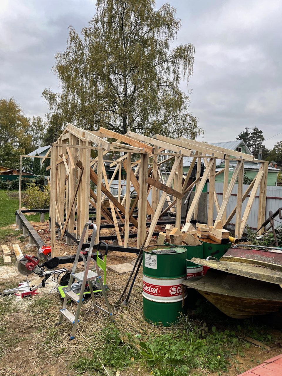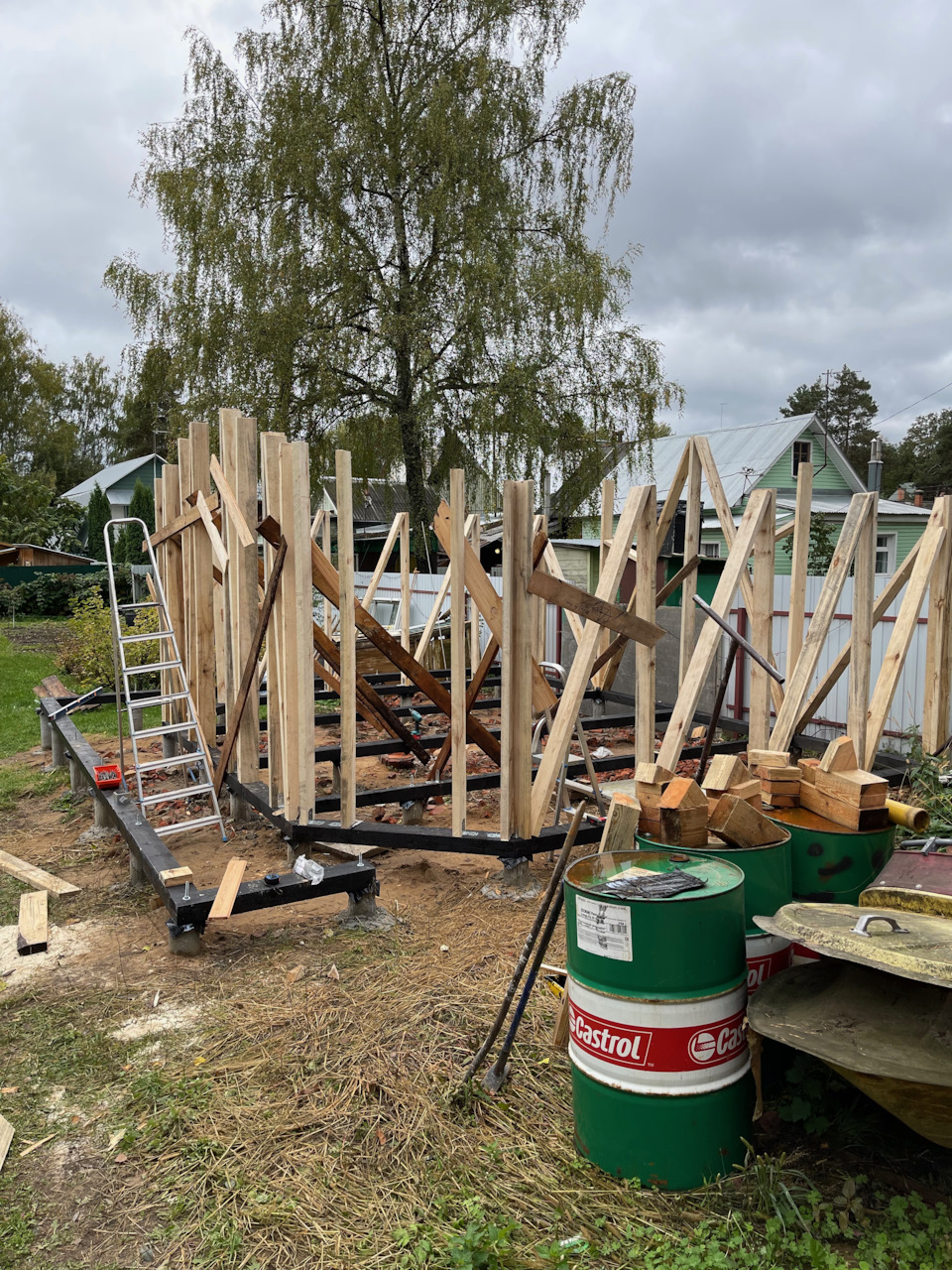 Замазал всю обвязку битумной мастикой, а дальше по проекту начал ставить каркас. Доски использовал осиновые, они очень низкого качества, некоторые впитали столько влаги, что начали гнить, их пришлось выбрасывать. Остальные из-за повышенной влажности имели просто чумовой вес и очень плохо пилились. Но деваться было мне некуда.