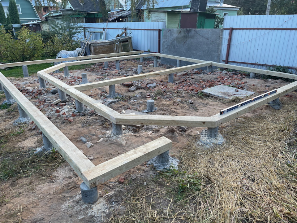 Затем приехал драгоценный брус для обвязки фундамента, запиливал его под лапы, ничего тут сложного, только вес немалый.
