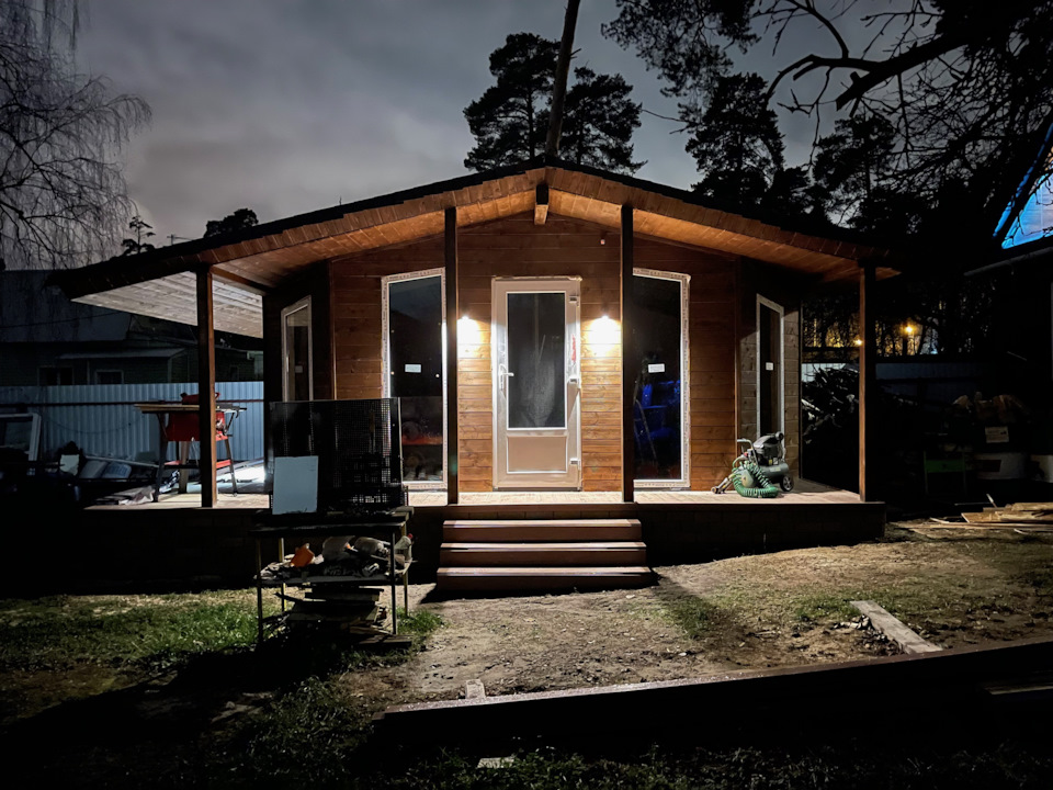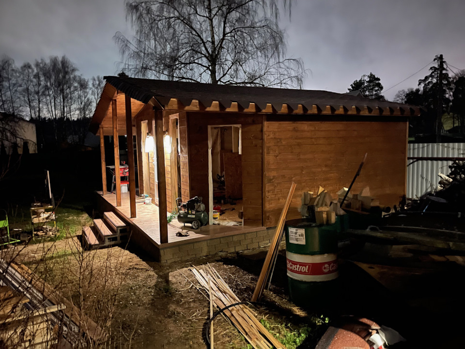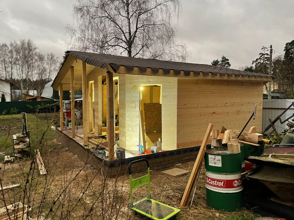 Каракас снаружи я обшивал блокхаусом, который уже с середины лета 2021-го отпускали по цене 800р за 1 м. кв. Кровля выполнена из моей любимой гибкой черепицы Технониколь. Она кстати не подорожала в отличие от металла и обошлась дешевле металлочерепицы