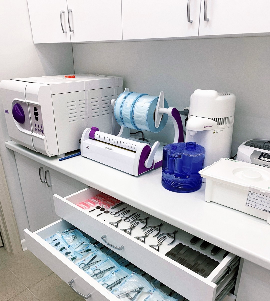 У нас есть отдельная комната дезинфекции и стерилизации, где все инструменты обрабатываются в три этапа. Сначала погружаются в специальный раствор, потом очищаются в ультразвуковой мойке и далее стерилизуются в медицинском автоклаве.