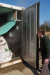Джеймс купил этот комплект за 4295 фунтов стерлингов и инсталлировал его в 20-футовый изолированный транспортный контейнер. Цель — сушка твердых пород до влажности 10-12%, и, как показывает влагомер, она достижима в сушилке, которая была полностью собрана за два рабочих дня.