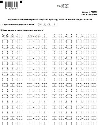 - Лист А «Сведения о кодах по Общероссийскому классификатору видов экономической деятельности» заполнять, используя коды нового классификатора ОКВЭД-2. В разделе 1 «Код основного вида деятельности» и 2 «Коды дополнительных видов деятельности» указывается не менее четырех цифровых знаков. Коды дополнительных видов деятельности указываются по возрастанию слева направо.